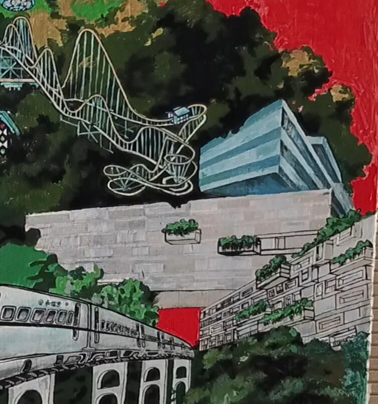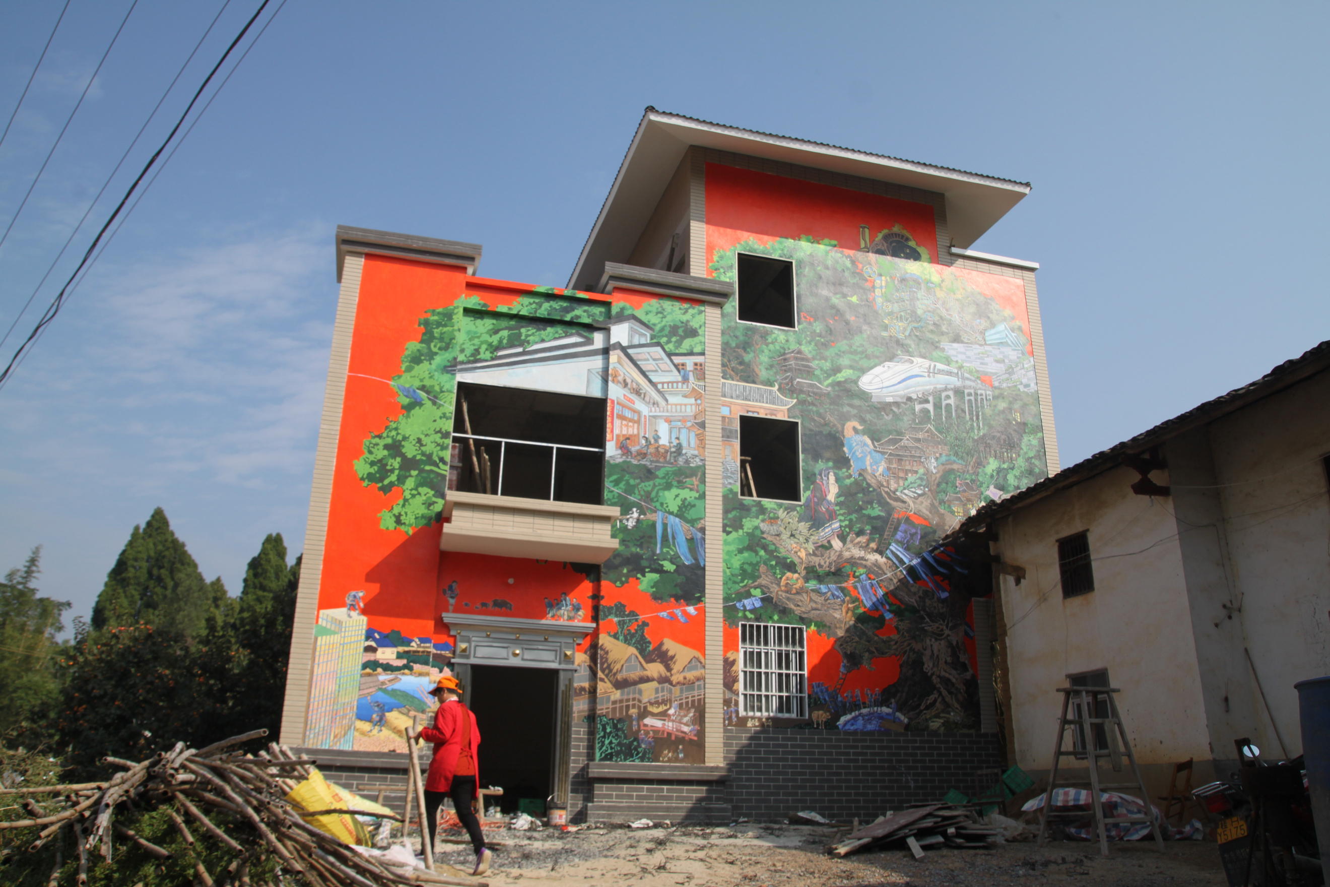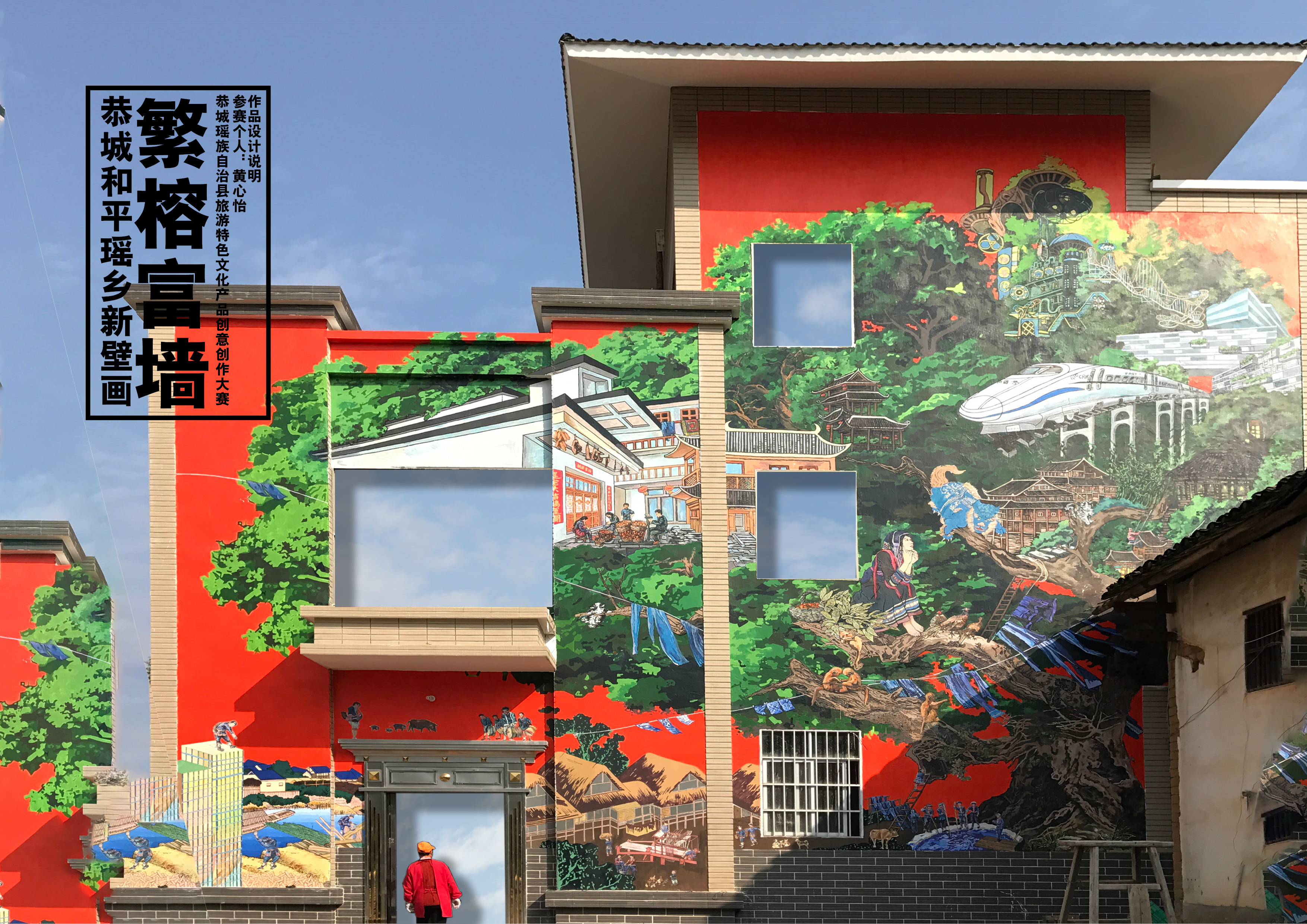 新瑶乡壁画位于瑶族人民聚居地广西省桂林市恭城瑶族自治县下的和平乡。瑶族人民世代居住在此地,画面采用红与绿的冲突颜色,表现热闹气氛。一棵繁茂大树寓意“开枝散叶”。依次表达了瑶族人过去的,现在的,未来的建筑风貌,表现瑶人新生活及对未来的美好向往。